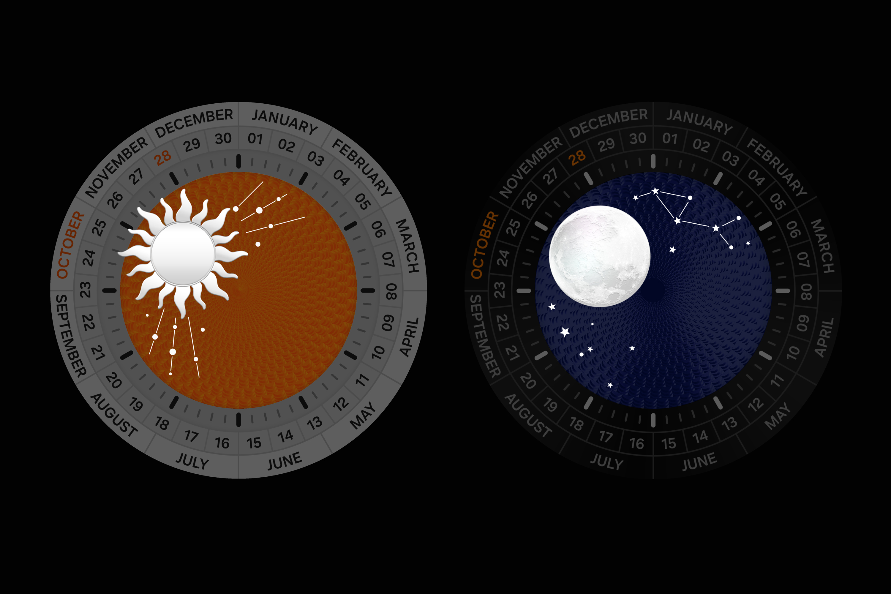 A Day & Night complication that visualizes the movement of the sun and moon over 24 hours adds both classic watch aesthetics and precise functionality. It goes beyond simply displaying the time to convey the rhythm and atmosphere of the day, reinforcing the connection between analog sensibility and the smart display.